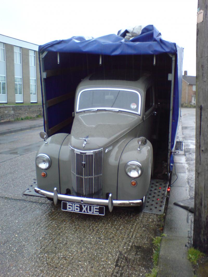 A LOVELY FORD PREFECT BEING LOADED IN WORTHING -DESTINED FOR PEMBROKE DOCK AND ONTO IRELAND.